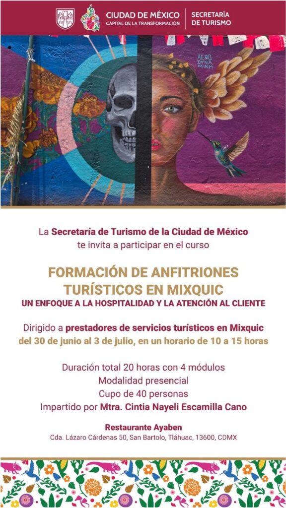 Como parte del plan integral anunciado por la Jefa de Gobierno de la Ciudad de México, con mira al 2026, para fortalecer San Andrés Mixquic, se llevó a cabo con gran éxito el curso “Formación de Anfitriones Turísticos en Mixquic”, capacitando a 20 mujeres y 13 hombres de la comunidad. Esta experiencia presencial potenció sus habilidades en hospitalidad y atención al cliente, impulsando un turismo auténtico, cultural y de calidad que contribuye al desarrollo sostenible de este emblemático destino.