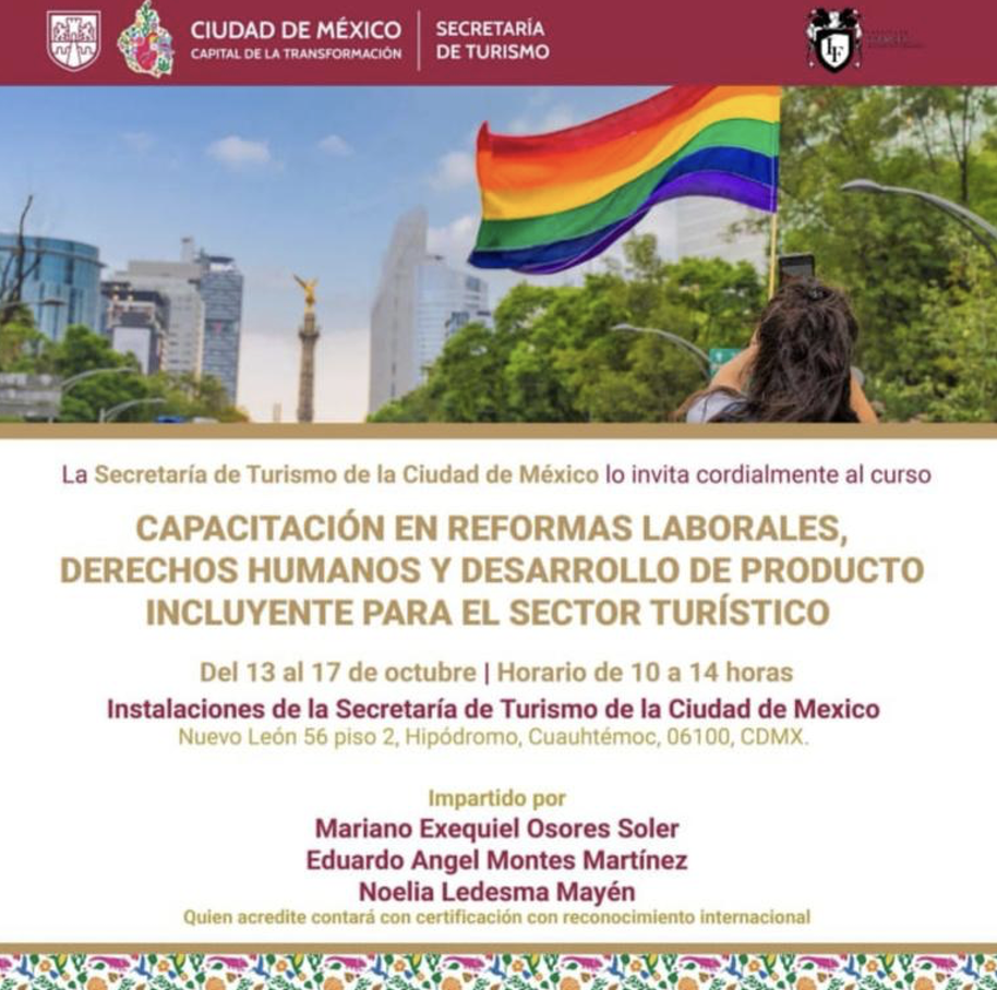 El curso “Reformas Laborales, Derechos Humanos e Inclusión” se impartió del 13 al 17 de octubre, en un horario de 10:00 a 14:00 horas, con una duración total de 20 horas, en las instalaciones de la Secretaría de Turismo de la Ciudad de México, ubicadas en Nuevo León 56, segundo piso, colonia Hipódromo, alcaldía Cuauhtémoc, Ciudad de México.
