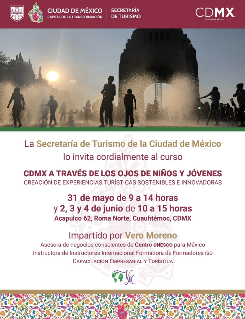 El curso “CDMX a través de los ojos de niños y jóvenes: creación de experiencias turísticas sostenibles e innovadoras” se llevó a cabo los días 31 de mayo, 2, 3 y 4 de junio, con una duración total de 20 horas, en la sede ubicada en Acapulco 62, colonia Roma Norte, alcaldía Cuauhtémoc, Ciudad de México.