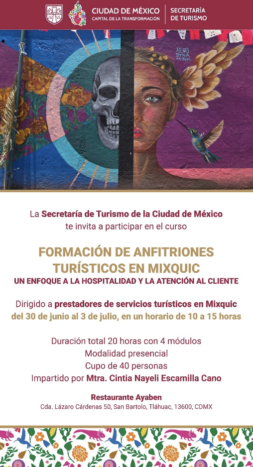 Como parte del Plan Integral anunciado por la Jefa de Gobierno de la Ciudad de México, con miras al 2026, para fortalecer San Andrés Mixquic, se llevó a cabo con gran éxito el curso “Formación de Anfitriones Turísticos en Mixquic”, realizado del 30 de junio al 3 de julio de 2025, en modalidad presencial, con una duración total de 20 horas.