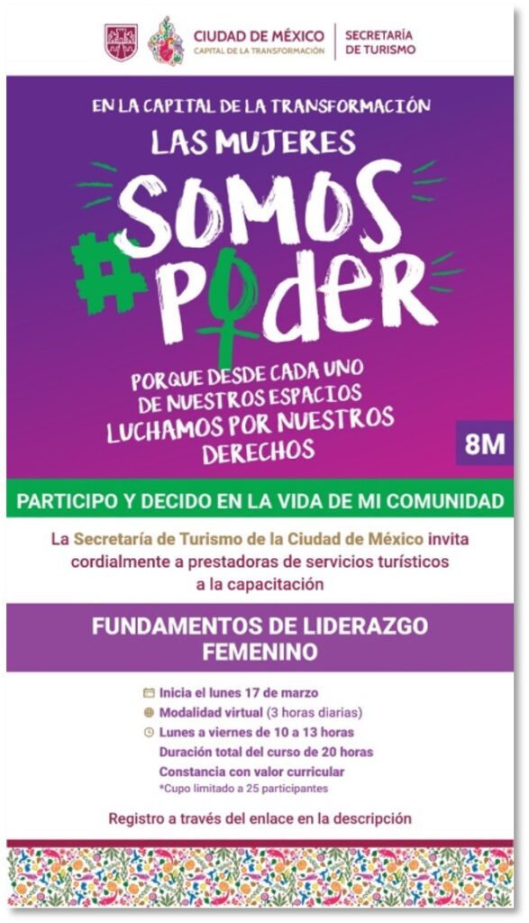 Del 17 al 21 de marzo se llevó a cabo el Curso Liderazgo Femenino, dirigido a mujeres del sector turístico, con especial participación de asistentes provenientes de distintas alcaldías, principalmente de Xochimilco. Con una duración de 20 horas en modalidad virtual, de 10:00 a 13:00 horas, el curso buscó desarrollar habilidades y fortalecer la confianza de las participantes en roles de liderazgo, promoviendo la equidad de género y el empoderamiento femenino.