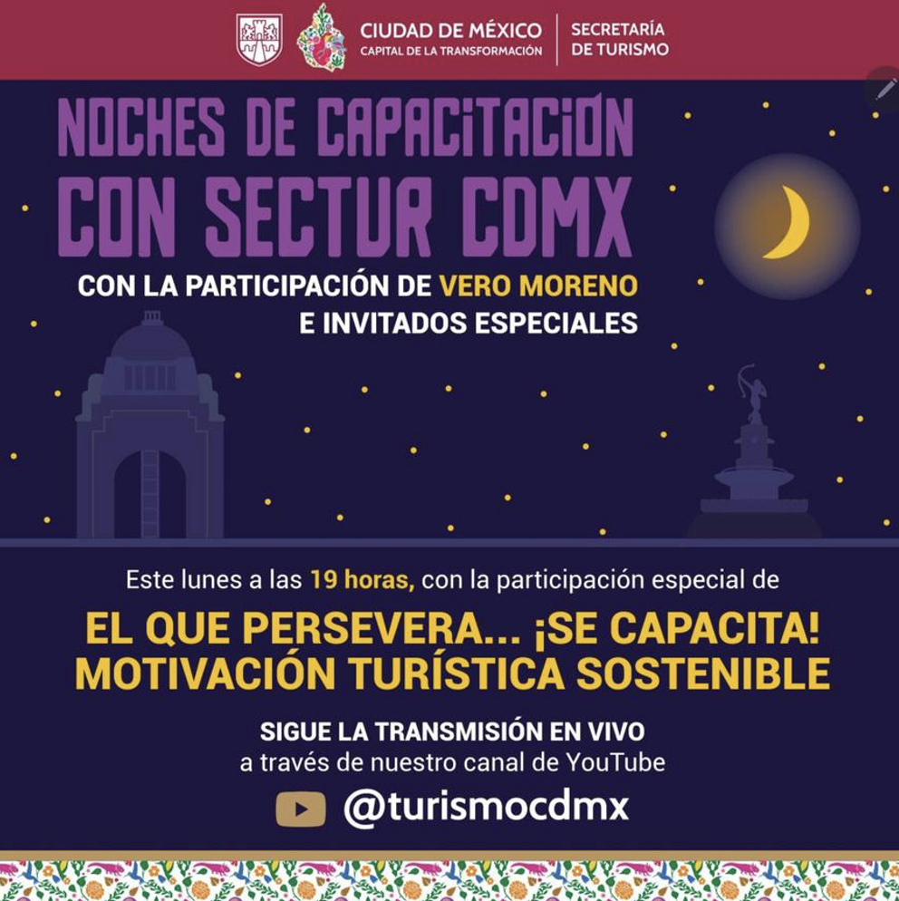 La sesión “El que persevera… ¡Se capacita! Motivación Turística Sostenible” se llevó a cabo en modalidad virtual el 10 de noviembre, con una duración de 2 horas, en un horario de 19:00 a 21:00 horas.